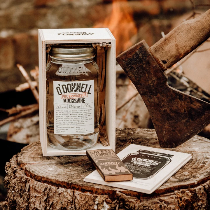 Die Holzbox kannst du zerschlagen, in deinen Grill schmeißen, dann “Feuerwasser” drüber kippen und anzünden. Aber der Schnaps brennt nicht nur gut, sondern schmeckt umso besser. Deshalb empfehlen wir dir auf jeden Fall: weniger verbrennen, mehr trinken.